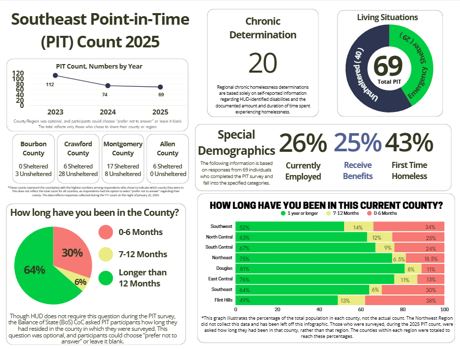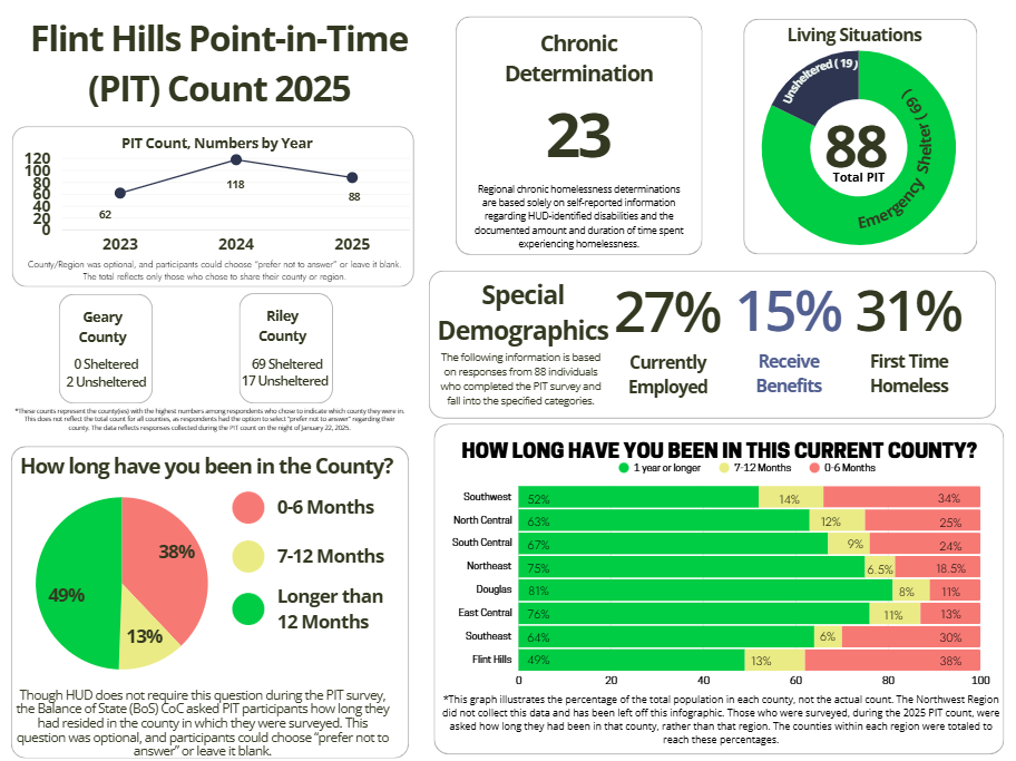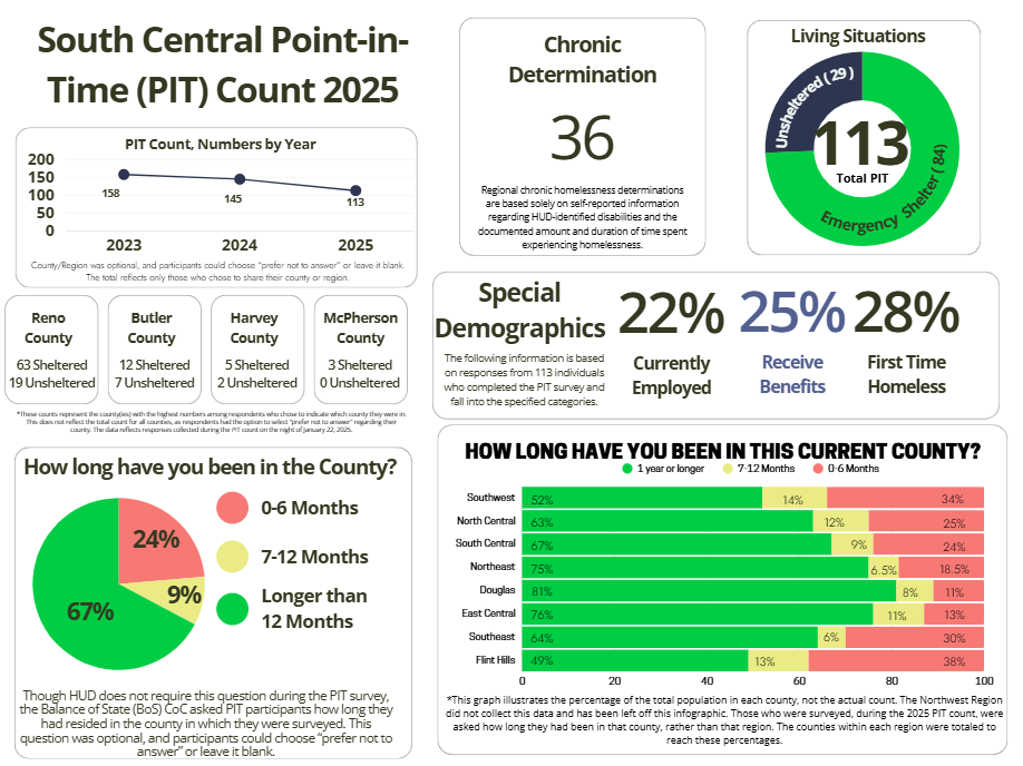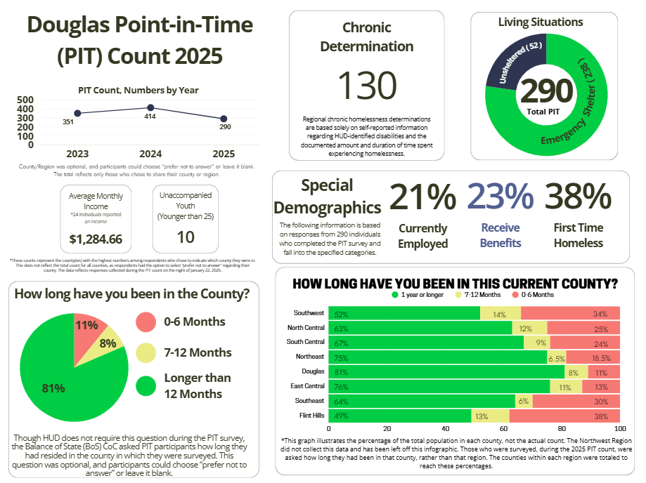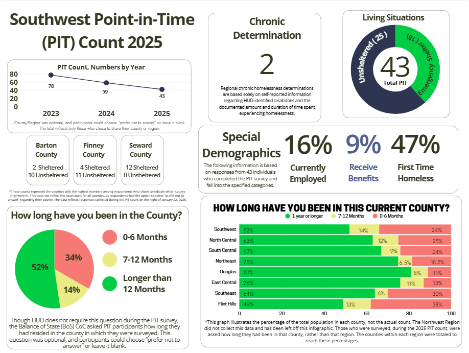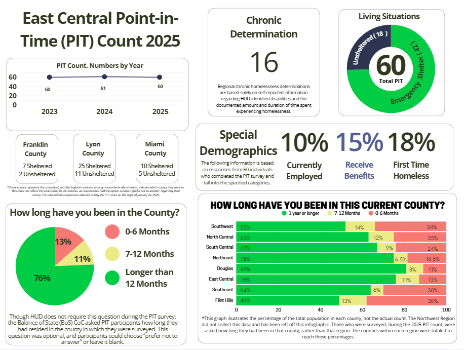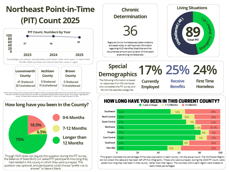 The Kansas Balance of State CoC covers 101 counties and is organized into 9 regions. Each region brings together a network of partners involved in the homeless response system—including service providers, healthcare professionals, McKinney-Vento liaisons, city and county officials, HUD-funded and non-funded agencies, and community advocates.