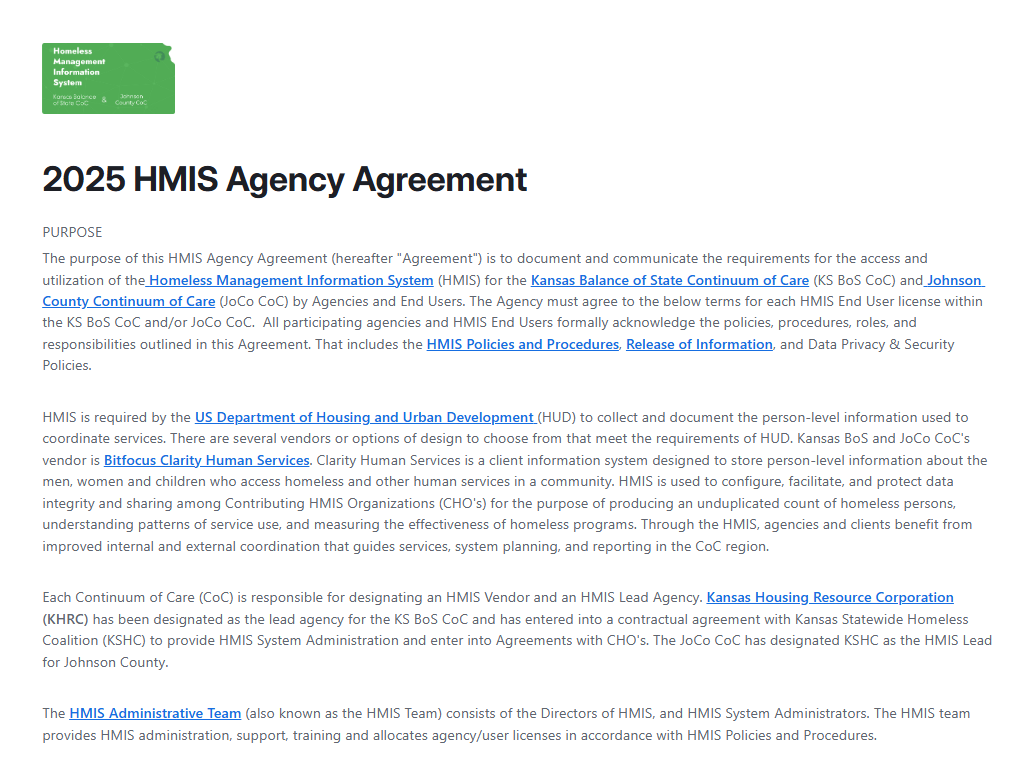 The 2025 Agency Agreement is the starting place for new HMIS end users- simply have your authorized agency representative (anyone who is authorized to sign on behalf of the agency) submit this agreement for staff members who need access to HMIS.